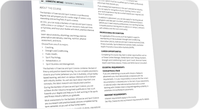 MEDICINE AND HEALTH Bachelor of Exercise and Sport Science Practical Experience As part of the Bachelor of Exercise and Sport Science, you will SATAC CODE – 104851 complete two supervised practical placements. The first will be Casuarina, Online a general practical placement of 140 hours. The second will be a specialised placement of 140-280 hours, depending on your UAC CODE – 590590 major. Casuarina, Online You are not required to travel for your placement; it can be completed anywhere in the world. You'll choose your own DURATION – 3 years full-time, 6 years part-time supervisor (which must be a qualified sport or health professional) and a topic that interests you. DOMESTIC INTAKE – Semester 1, Semester 2 If you already have experience in the sport and exercise industry, you can apply for recognition of prior learning. Some or all of ABOUT THE COURSE your work experience may be counted towards your required 140 hours of placement. The Bachelor of Exercise and Sport Science is a professional In addition to placement, you can also apply for learning abroad degree that will prepare you for a wide range of careers in the programs and take part in a short, practical intensive in Darwin rewarding and exciting field of sports science. (where you'll meet industry professionals, tour sporting facilities, At CDU, you can study a Bachelor of Exercise and Sport Science complete practical training and simulations on campus, and work 100% online or on campus*. You can choose to study part-time with athletes and the local community). or full-time, and focus your studies with short, practical intensive PROFESSIONAL RECOGNITION units. Learn about anatomy, physiology, psychology, exercise As a graduate of this course you'll be eligible to apply for prescription and delivery, coaching, nutrition, physical membership of the Australian Strength and Conditioning assessment, and more. Association (ASCA), Exercise and Sport Science Australia (ESSA) Choose from one of six majors: Fitness Australia, Sports Medicine Australia (SMA), Australian Health Promotion Association Australia (AHPA). > Coaching, > Strength and Conditioning, CAREER OPPORTUNITIES > Public Health, Completing this course may lead to career opportunities such as > Sport Psychology, a Fitness Centre Manager, Rehabilitation and Therapy Assistant, > Rehabilitation, or Strength and Conditioning Coach, Sport Coach, Personal Trainer, > Sport Business and Management. Health and Fitness Advisor, Fitness and Performance Consultant. The Bachelor of Exercise and Sport Science combines the best of ESSENTIAL REQUIREMENTS theory and practice-based learning. You can complete placements Criminal History Check close to your home (wherever you live in Australia), virtual-reality- If you are undertaking a course with clinical or fieldwork based learning, and short on-campus intensive units in Darwin placements you must demonstrate compliance with the with industry bodies. You will also learn about important core requirements. It is your responsibility to ensure that the correct concepts, the latest research and industry best-practice. documentation is obtained prior to the start of your placements. During the Bachelor of Exercise and Sport Science, you can A national and/or international police check and a current achieve shorter industry-recognised qualifications that count Working with Children check is required regarding suitability to towards your degree and help you to start working in the sports undertake clinical/fieldwork placements. and fitness industry before you graduate. INHERENT REQUIREMENTS Most assessments for the Bachelor of Exercise and Sport Science Inherent requirements apply to this course. are coursework and practice-based, and are completed during See http://www.cdu.edu.au/inherent-requirements for details. term semester, so you will sit few formal exams. *Online study is only available to domestic students. International students are required to study on campus. Charles Darwin University 55 2023 undergraduate and postgraduate degrees