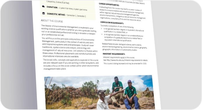 ENVIRONMENTAL STUDIES Master of Environmental Management The course is flexible and caters to your individual needs. It balances required knowledge and technical skills, develops SATAC CODE – 1CM089 conceptual skills, and challenges you to apply them to natural Casuarina, Online (Commonwealth Supported) resource management within its complex social context. SATAC CODE – 1CM589 PROFESSIONAL RECOGNITION Casuarina, Online (Full Fee) Graduates may seek professional membership to associations UAC CODE – 823220 such as the Australian Rangelands Society, Ecological Society of Casuarina, Online (Commonwealth Supported) Australia and Environment Institute of Australia and New Zealand. UAC CODE – 873220 CAREER OPPORTUNITIES Casuarina, Online (Full Fee) Graduating from this course may lead to a career in areas of DURATION – 2 years full-time, 4 years part-time research or environmental and natural resources management, within regional natural resource management agencies, environmental NGOs, Indigenous natural resources management DOMESTIC INTAKE – Semester 1, Semester 2 organisations, consultancy firms and the resources sector. ABOUT THE COURSE ADMISSION REQUIREMENTS Successful completion of one of the following: The Master of Environmental Management complements your > a recognised bachelor degree or equivalent international existing science qualifications whether you are a graduate starting qualification in a related field; or out or an established professional looking to broaden or deepen > a recognised bachelor degree in an unrelated field plus your professional skill set. completion of a graduate diploma in a related field or You will focus on the principles and practices of Environmental equivalent international qualification. Management, particularly in the context of wet-dry and semi- Related fields include: biological science, earth science, arid tropical ecosystems and arid landscapes. Study will cover environmental engineering, environmental science, geography, livelihoods, spatial science and analysis, and ecology and geographic information or sustainability studies. management of natural resources. Unit selection is flexible within these areas. Professional placements and remote Australia and INHERENT REQUIREMENTS international intensives are also available. Inherent requirements apply to this course. The broad skills, concepts and applications explored in this course See http://www.cdu.edu.au/inherent-requirements for details. are also relevant even if you are working in other ecosystems, and This course is being reviewed and may be amended for 2023. includes a focus on the social context within which environmental management takes place. Charles Darwin University 91 2023 undergraduate and postgraduate degrees