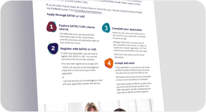 How to apply There are several ways to apply to study at Charles Darwin University. You can apply via a Tertiary Admissions Centre. If you live in the Northern Territory, South Australia, Victoria, Western Australia, Tasmania or the Australian Capital Territory, apply via the South Australian Tertiary Admissions Centre (SATAC). If you are a resident of New South Wales, apply via the Universities Admissions Centre (UAC). If you're returning to study at Charles Darwin University, you may be eligible to apply directly via MyNextCourse. Visit mynextcourse.cdu.edu.au Apply through SATAC or UAC 1 Explore SATAC/UAC course 3 Complete your application search Follow the instructions from SATAC/UAC to Visit satac.edu.au or uac.edu.au to find start and finish your application. Remember information about entry requirements, to save as you go! selection processes and application dates for Although SATAC/UAC can access most of your preferred course. your Australian study records, it's helpful to upload your relevant registration, VET/TAFE 2 Register with SATAC or UAC and overseas qualifications when you apply. To start your application, you will need to SATAC/UAC may contact you for further register with SATAC or UAC. You can find information. instructions for this on their websites. Once you have registered as an applicant: 4 Accept and enrol - SATAC will send you an acknowledgment If your application is successful you will receive email with a link to access your online an offer to study at Charles Darwin University. application This will arrive via email from SATAC or UAC. or Shortly after that, we will email you information - UAC will send you an acknowledgment email on how to enrol and attend our orientation. with your application number and UAC pin. If you have received an offer for a quota course, you must enrol by the date specified in your offer. If you don't, the offer will lapse and your place may be offered to another applicant. 101010 CCCharharharllleeesss D D Darararwwwiiinnn U U Unnniiivvversersersiiitttyyy 222000222332 u u unnndedederrrgrgrgraaaddduuuaaattteee a a annnddd p p pooossstttgrgrgraaaddduuuaaattteee de de degrgrgreeeeseses