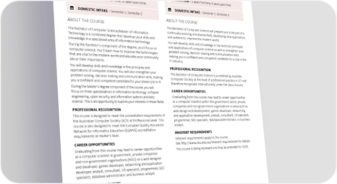 COMPUTING AND INFORMATION TECHNOLOGY Bachelor of Computer Science/ Bachelor of Computer Science Master of Information Technology SATAC CODE – 104491 SATAC CODE – 104492 Casuarina, Online Casuarina, Online UAC CODE – 590260 UAC CODE – 590130 Casuarina, Online Casuarina, Online DURATION – 3 years full-time, 6 years part-time DURATION – 5 years full-time, 10 years part-time DOMESTIC INTAKE – Semester 1, Semester 2 DOMESTIC INTAKE – Semester 1, Semester 2 ABOUT THE COURSE ABOUT THE COURSE The Bachelor of Computer Science will prepare you to be part of a The Bachelor of Computer Science/Master of Information continually evolving and diverse field, developing new applications Technology is a combined degree that develops your skills and and systems to improve the modern world. knowledge in a specialised area of information technology. You will develop skills and knowledge in the technical principles During the Bachelor's component of the degree, you'll focus on and applications of computer science as well as strengthen your computer science. You'll learn how to improve the technologies problem solving, decision making and communication skills that are vital to the modern world and educate your community making you a confident and competent candidate for a role in the about their importance. IT industry. You will develop skills and knowledge in the principles and PROFESSIONAL RECOGNITION applications of computer science. You will also strengthen your The Bachelor of Computer Science is accredited by Australia problem solving, decision making and communication skills, making Computer Society at the level of professional practice in ICT and you a confident and competent candidate for your dream job in IT. therefore recognised internationally under the Seoul Accord. During the Master's degree component of the course, you will CAREER OPPORTUNITIES focus on three specialisations in information technology: software engineering, cyber security, and information systems and data Graduating from this course may lead to career opportunities science. This is an opportunity to explore your interests in these fields. as a computer scientist within the government sector, private companies and non-government organisations in areas such as PROFESSIONAL RECOGNITION web design and development, games developer, networking This course is designed to meet the accreditation requirements of and application development, analyst, consultant, UX specialist, the Australian Computer Society (ACS) at Professional Level. This programmer, SEO specialist, database administrator, or business course is also designed to meet the European Quality Assurance analyst. Network for Informatics Education (EQANIE) accreditation INHERENT REQUIREMENTS requirements at master's level. Inherent requirements apply to this course. CAREER OPPORTUNITIES See http://www.cdu.edu.au/inherent-requirements for details. Graduating from this course may lead to career opportunities This course is being reviewed and may be amended for 2023. as a computer scientist in government, private companies and non-government organisations (NGO) as a web designer and developer, games developer, networking and application developer, analyst, consultant, UX specialist, programmer, SEO specialist, database administrator and business analyst. INHERENT REQUIREMENTS Inherent requirements apply to this course. See http://www.cdu.edu.au/inherent-requirements for details. This course is being reviewed and may be amended for 2023. Charles Darwin University 25 2023 undergraduate and postgraduate degrees