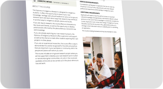 ABORIGINAL AND AUSTRALIAN STUDIES Diploma of Indigenous Research CAREER OPPORTUNITIES You will graduate with the knowledge and skills that are useful SATAC CODE – 116241 for research within Aboriginal and Torres Strait Islander contexts, Casuarina, Online organisations and communities, government departments and agencies or private agencies and organisations that are involved UAC CODE – 591060 in Indigenous research. The course seeks to credential the Casuarina, Online Indigenous research knowledge and skills you already have and helps you apply it in other research settings. DURATION – 1 year full-time, 2 years part-time ADMISSION REQUIREMENTS DOMESTIC INTAKE – Semester 1, Semester 2 Consideration will be given to applicants that do not meet the University's minimum entry requirements who have relevant ABOUT THE COURSE professional experience and knowledge in Indigenous work. The Diploma of Indigenous Research is designed for Indigenous ADDITIONAL REQUIREMENTS students. It offers the opportunity to draw on your own Applicants will need to have the ability to draw on important knowledge, heritage and cultural traditions to carry out on-ground cultural knowledge and experiences, and observe relevant cultural research work and learn about ways that research may contribute protocols in the use of that knowledge to successfully complete this in positive ways to Indigenous people, places and futures. course. Applicants must contact the College of Indigenous Futures, Education and the Arts by email cifea_qateam@cdu.edu.au to If you are new to research, this course offers an introduction to arrange a short interview to discuss suitability prior to submitting key issues and themes, as well as the opportunity to develop an application. practical skills informed by the place where you live and its law This course is being reviewed and may be amended for 2023. and knowledge. If you are already exploring your own research projects, the Diploma of Indigenous Research offers supervision and support, as well as the chance to meet other students exploring their own projects in other places. If you are an experienced researcher, the course offers a way to demonstrate this and be recognised for the skills and practices that are important in your workplace or community and to the people and places with whom you work. This course includes an on-ground research project where you will be supported to develop your own research work in urban or remote Aboriginal communities. All units in the course are available online and can be carried out in the places where you live and work. Charles Darwin University 20 2023 undergraduate and postgraduate degrees