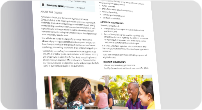 HUMANITIES; SOCIAL SCIENCES AND RELIGIOUS STUDIES Bachelor of Psychological Science PROFESSIONAL RECOGNITION (Graduate Entry) Our Bachelor of Psychological Science (Graduate Entry) course is accredited by the Australian Psychology Accreditation Council SATAC CODE – 1BG016 (APAC) and prepares you for entry into an Honours year in Casuarina, Online psychology. During your studies, you can also join the Australian Psychological Society as a student member. UAC CODE – 820100 CAREER OPPORTUNITIES Casuarina, Online As a graduate of our Bachelor of Psychological Science (Graduate DURATION – 1 year full-time, 2 years part-time Entry) you may find employment in: > human resources, DOMESTIC INTAKE – Semester 1, Semester 2 > preventative health education and training, > community services, ABOUT THE COURSE > advertising and marketing, and > sport and rehabilitation. Pursue your dream. Our Bachelor of Psychological Science ADMISSION REQUIREMENTS (Graduate Entry) is the stepping stone to a career as a psychologist. Undertake this Australian Psychology Accreditation Council (APAC) Successful completion of: accredited degree online, on campus, or via a combination of both. > a recognised bachelor degree or equivalent international It provides you an integrated and foundational understanding of qualification; and human behaviour including the fundamental premise of psychology > Successful completion of first year CDU psychology units as an empirically based science. PSY150 Introduction to Psychology A and PSY151 Introduction You will also be skilled in a range of psychology fields such as to Psychology B; or equivalent units undertaken at another abnormal psychology, personality and development and you will institution as part of an APAC accredited degree. have the opportunity to take specialist electives such as forensic If you have undertaken equivalent units at an institution other psychology, counselling, alcohol and drugs and psychology of sport. than CDU you must attach the unit outlines to your application for Successfully completing the course and maintaining a minimum assessment. GPA of 5.5 or better (and a credit or better in PSY248 and PSY337) If you have completed an APAC accredited degree you are not will prepare you to undertake further study by applying to enrol eligible for entry. into an Honours degree at CDU or elsewhere. Please note that INHERENT REQUIREMENTS our Honours degree is subject to a quota, and your opportunity to enrol in our Honours degree is not guaranteed. Inherent requirements apply to this course. See http://www.cdu.edu.au/inherent-requirements for details. Charles Darwin University 69 2023 undergraduate and postgraduate degrees