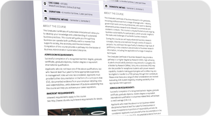BUSINESS AND ECONOMICS Graduate Certificate of Sustainable Graduate Certificate of Business Research Enterprise SATAC CODE – 1GC562 SATAC CODE – 1GC563 Waterfront Darwin, Online (Full Fee) Waterfront Darwin, Online (Full Fee) UAC CODE – 871101 SATAC CODE – 1GC568 Waterfront Darwin, Online (Full Fee) Katherine (Full Fee) SATAC CODE – 1GC569 DURATION – 6 months full-time, 1 year part-time Alice Springs (Full Fee) UAC CODE – 871081 DOMESTIC INTAKE – Semester 1, Semester 2 Waterfront Darwin, Online (Full Fee) ABOUT THE COURSE DURATION – 6 months full-time, 1 year part-time The Graduate Certificate of Business Research is for graduates, DOMESTIC INTAKE – Semester 1, Semester 2 including professionals from a range of backgrounds - industry, government and community enterprises, who want to develop advanced business research skills relevant to commercial and ABOUT THE COURSE academic contexts. This course is uniquely framed around ongoing The Graduate Certificate of Sustainable Enterprise will allow you business sustainability focused projects, which provide insights to to develop your knowledge and understanding of sustainable the tasks and challenges of authentic business research. business practices. This course will guide you through how During this course you will apply advanced business research business can operate both profitably and in a manner that concepts, theories and methods through a series of research supports society, the economy and the environment. projects. You will have the opportunity to develop a high level of Completion of this course provides a pathway into the Master of proficiency in the collection and utilisation of business research Business Administration Sustainable Enterprise. information, including the application of a range of analytical techniques. ADMISSION REQUIREMENTS The Graduate Certificate of Business Research may provide a Successful completion of a recognised bachelor degree, graduate pathway to a Higher Degree by Research (HDR). High achieving certificate, graduate diploma, masters degree or equivalent students should satisfy admission requirements to progress into international qualification. a Master by Research (MRes). Entry into a doctorate (PhD) may Applicants who do not have one of the above qualifications, but also be possible for exceptional students with proven research who have at least four years full time appropriate experience capability. Students making good progress with a MRes may also in management roles will also be considered. Applicants must be eligible to transfer to a PhD partway through their candidature. provide further documentation in the form of a curriculum vitae Please note there are a range of other considerations are involved (CV), documented evidence from your employer detailing roles evaluating HDR student eligibility, including availability of an and responsibilities, and a statement of purpose addressing how appropriate HDR Supervisor. the course will help you achieve your career aspirations. ADMISSION REQUIREMENTS INHERENT REQUIREMENTS Successful completion of a recognised bachelor degree, graduate Inherent requirements apply to this course. certificate, graduate diploma, masters degree or equivalent See http://www.cdu.edu.au/inherent-requirements for details. international qualification in a business related field, with at least a credit average (GPA 5.0). Applicants who meet the above in a non-business-related discipline but have at least four years full time business or research experience in positions of responsibility will also be considered. Applicants must provide further documentation in the form of a curriculum vitae (CV), documented evidence from your employer detailing roles and responsibilities, and a statement of purpose addressing how the course will help you achieve your career aspirations. INHERENT REQUIREMENTS Inherent requirements apply to this course. See http://www.cdu.edu.au/inherent-requirements for details. Charles Darwin University 81 2023 undergraduate and postgraduate degrees