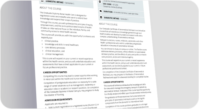 MEDICINE AND HEALTH Graduate Diploma of Renal Care Graduate Certificate of Aeromedical Retrieval SATAC CODE – 1GD538 SATAC CODE – 1GC048 Online (Full Fee) Casuarina, Online (Commonwealth Supported) UAC CODE – 872112 SATAC CODE – 1GC548 Online (Full Fee) Casuarina, Online (Full Fee) UAC CODE – 821292 DURATION – 1 year full-time, 2 years part-time Casuarina, Online (Commonwealth Supported) UAC CODE – 871292 DOMESTIC INTAKE – Semester 1 Casuarina, Online (Full Fee) ABOUT THE COURSE DURATION – 6 months full-time, 1 year part-time The Graduate Diploma Renal Health Care is designed for DOMESTIC INTAKE – Semester 1 registered nurses and midwifes who want to extend their knowledge and expand their scope of practice. ABOUT THE COURSE Through this course, you will synthesise the principles of equity, empowerment, and the socio-political determinants of health. Our Graduate Certificate of Aeromedical Retrieval is an innovative It takes an inter-sectoral focus on the individual, family, and course that will extend your knowledge gained through your community access to renal health services. health studies and develop foundational research skills and a The course will provide you with the opportunity to enhance and complex understanding of aeromedical retrieval. expand your: Relevant to doctors, nurses, midwives, paramedics and other > clinical practice health professionals who wish to undertake postgraduate > knowledge and skills in renal healthcare education in the area of aeromedical retrieval. > care delivery processes You can choose to study on campus or online. This flexible course > clinical education, and addresses delivery processes, critical reflection on aeromedical > clinical management. retrieval practice, and the effects of policy and politics on health care provision, access and individual agency. This course will expand on your current or recent experience This course will expand on your current or recent experience within the health service, and you will undertake education and within the health service, and you will undertake education and assessments that have a direct application to your current or assessments can be directly applied to your current or future future professional practice. professional practice and context. CAREER OPPORTUNITIES On completion of the Graduate Certificate of Aeromedical Completing this course may lead to career opportunities working Retrieval, you may progress to the Master of Aeromedical in renal care within the health and human services sector. Retrieval and apply for advanced standing for completed studies. Completion of postgraduate education is a necessity for a wide CAREER OPPORTUNITIES range of career advances such as management, leadership or This course will enhance and develop the knowledge and skills education roles or academic or research positions. On completion for roles which manage the emergency transport of patients by of the Graduate Diploma in Renal Care you may progress to study aeromedical retrieval. Graduates of this course have the opportunity the Master of Nursing. to critically analyse and reflect upon the aeromedical retrieval journey. ADMISSION REQUIREMENTS The graduate certificate examines the fundamentals and Applicants are required to: principles of aeromedical retrieval as well as the logistic > hold current registration as a registered nurse (Division 1) or components from the domestic to international level. registered midwife with the Australian Health Practitioner Completion of this course positions graduates in a stronger Regulation Agency (AHPRA). position to undertake senior clinical and administrative roles > be currently employed in a renal related area and have within their organisation. worked in this field for at least 1 year at 0.4FTE, approximately ADMISSION REQUIREMENTS 16 hours per week. > provide details of their employment in this field which should Australian citizens and permanent residents must demonstrate be completed at the time of submitting their application. current registration with the Australian Health Practitioner Regulation Agency (AHPRA). International applicants must demonstrate current registration/ affiliation/license with the relevant nursing/medical body in their country of origin. It is expected applicants have recent work experience in a health setting. 120 Charles Darwin University 2023 undergraduate and postgraduate degrees