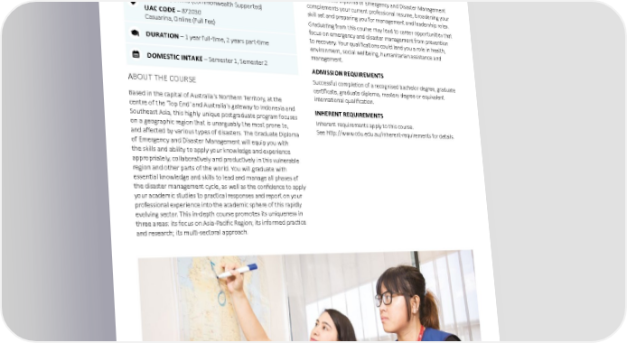 HUMANITIES, SOCIAL SCIENCES AND RELIGIOUS STUDIES Graduate Diploma of Emergency and This course is a pathway for further studies (for example, into a Master of Emergency and Disaster Management) and is Disaster Management supported by nationally and internationally respected industry partners. The Graduate Diploma and Graduate Certificate in SATAC CODE – 1GD022 Emergency and Disaster Management are entry and exit pathways Casuarina, Online (Commonwealth Supported) for the Master's degree. SATAC CODE – 1GD522 CAREER OPPORTUNITIES Casuarina, Online (Full Fee) The Graduate Diploma of Emergency and Disaster Management UAC CODE – 822030 complements your current professional resume, broadening your Casuarina, Online (Commonwealth Supported) skill set and preparing you for management and leadership roles. UAC CODE – 872030 Graduating from this course may lead to career opportunities that Casuarina, Online (Full Fee) focus on emergency and disaster management from prevention DURATION – 1 year full-time, 2 years part-time to recovery. Your qualifications could land you a role in health, environment, social wellbeing, humanitarian assistance and management. DOMESTIC INTAKE – Semester 1, Semester 2 ADMISSION REQUIREMENTS ABOUT THE COURSE Successful completion of a recognised bachelor degree, graduate certificate, graduate diploma, masters degree or equivalent Based in the capital of Australia's Northern Territory, at the international qualification. centre of the 'Top End' and Australia's gateway to Indonesia and INHERENT REQUIREMENTS Southeast Asia, this highly unique postgraduate program focuses Inherent requirements apply to this course. on a geographic region that is unarguably the most prone to, See http://www.cdu.edu.au/inherent-requirements for details. and affected by various types of disasters. The Graduate Diploma of Emergency and Disaster Management will equip you with the skills and ability to apply your knowledge and experience appropriately, collaboratively and productively in this vulnerable region and other parts of the world. You will graduate with essential knowledge and skills to lead and manage all phases of the disaster management cycle, as well as the confidence to apply your academic studies to practical responses and report on your professional experience into the academic sphere of this rapidly evolving sector. This in-depth course promotes its uniqueness in three areas: its focus on Asia-Pacific Region; its informed practice and research; its multi-sectoral approach. Charles Darwin University 96 2023 undergraduate and postgraduate degrees