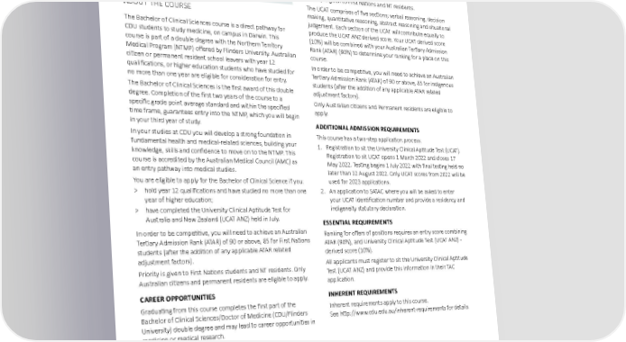 MEDICINE AND HEALTH Bachelor of Clinical Sciences ADMISSION REQUIREMENTS You are eligible to apply for the Bachelor of Clinical Science if you: SATAC CODE – 104661 > hold year 12 qualifications and have studied no more than one Casuarina year of higher education; and > have completed the University Clinical Aptitude Test for DURATION – 3 years full-time Australia and New Zealand (UCAT ANZ) held in July and August 2022. DOMESTIC INTAKE – Semester 1 Priority is given to First Nations and NT residents. The UCAT comprises of five sections; verbal reasoning, decision ABOUT THE COURSE making, quantitative reasoning, abstract reasoning and situational judgement. Each section of the UCAT will contribute equally to The Bachelor of Clinical Sciences course is a direct pathway for produce the UCAT ANZ derived score. Your UCAT derived score CDU students to study medicine, on campus in Darwin. This (10%) will be combined with your Australian Tertiary Admission course is part of a double degree with the Northern Territory Rank (ATAR) (90%) to determine your ranking for a place on this Medical Program (NTMP) offered by Flinders University. Australian course. citizen or permanent resident school leavers with year 12 In order to be competitive, you will need to achieve an Australian qualifications, or higher education students who have studied for Tertiary Admission Rank (ATAR) of 90 or above, 85 for indigenous no more than one year are eligible for consideration for entry. students (after the addition of any applicable ATAR related The Bachelor of Clinical Sciences is the first award of this double adjustment factors). degree. Completion of the first two years of the course to a Only Australian citizens and Permanent residents are eligible to specific grade point average standard and within the specified apply. time frame, guarantees entry into the NTMP, which you will begin in your third year of study. ADDITIONAL ADMISSION REQUIREMENTS In your studies at CDU you will develop a strong foundation in This course has a two-step application process: fundamental health and medical-related sciences, building your 1. Registration to sit the University Clinical Aptitude Test (UCAT). knowledge, skills and confidence to move on to the NTMP. This Registration to sit UCAT opens 1 March 2022 and closes 17 course is accredited by the Australian Medical Council (AMC) as May 2022. Testing begins 1 July 2022 with final testing held no an entry pathway into medical studies. later than 12 August 2022. Only UCAT scores from 2022 will be You are eligible to apply for the Bachelor of Clinical Science if you: used for 2023 applications. > hold year 12 qualifications and have studied no more than one 2. An application to SATAC where you will be asked to enter year of higher education; your UCAT identification number and provide a residency and > have completed the University Clinical Aptitude Test for indigeneity statutory declaration. Australia and New Zealand (UCAT ANZ) held in July. ESSENTIAL REQUIREMENTS In order to be competitive, you will need to achieve an Australian Ranking for offers of positions requires an entry score combining Tertiary Admission Rank (ATAR) of 90 or above, 85 for First Nations ATAR (90%), and University Clinical Aptitude Test (UCAT ANZ) - students (after the addition of any applicable ATAR related derived score (10%). adjustment factors). All applicants must register to sit the University Clinical Aptitude Priority is given to First Nations students and NT residents. Only Test (UCAT ANZ) and provide this information in their TAC Australian citizens and permanent residents are eligible to apply. application. CAREER OPPORTUNITIES INHERENT REQUIREMENTS Graduating from this course completes the first part of the Inherent requirements apply to this course. Bachelor of Clinical Sciences/Doctor of Medicine (CDU/Flinders See http://www.cdu.edu.au/inherent-requirements for details. University) double degree and may lead to career opportunities in medicine or medical research. Charles Darwin University 54 2023 undergraduate and postgraduate degrees
