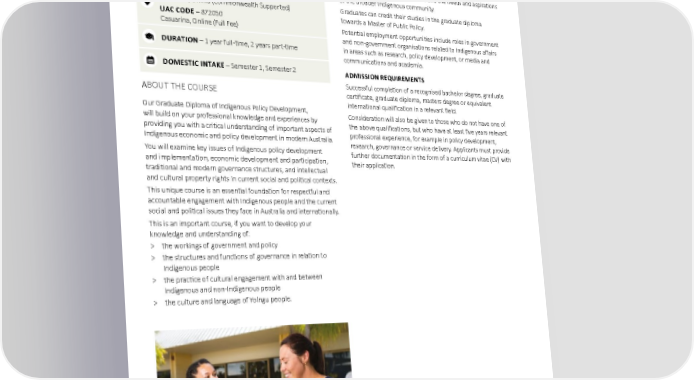 ABORIGINAL AND AUSTRALIAN STUDIES Graduate Diploma of Indigenous Policy CAREER OPPORTUNITIES Development A Graduate Diploma of Indigenous Policy Development will open up opportunities for you by adding a new dimension of SATAC CODE – 1GD021 knowledge and skills to your existing qualification. Graduates from Casuarina, Online (Commonwealth Supported) this course working in a range of different government and other professional roles enhance their employability by strengthening SATAC CODE – 1GD521 and deepening their understanding of the interface between Casuarina, Online (Full Fee) policy-related aspects of their work and the needs and aspirations UAC CODE – 822050 of the broader Indigenous community. Casuarina, Online (Commonwealth Supported) Graduates can credit their studies in the graduate diploma UAC CODE – 872050 towards a Master of Public Policy. Casuarina, Online (Full Fee) Potential employment opportunities include roles in government and non-government organisations related to Indigenous affairs DURATION – 1 year full-time, 2 years part-time in areas such as research, policy development, or media and communications and academia. DOMESTIC INTAKE – Semester 1, Semester 2 ADMISSION REQUIREMENTS Successful completion of a recognised bachelor degree, graduate ABOUT THE COURSE certificate, graduate diploma, masters degree or equivalent Our Graduate Diploma of Indigenous Policy Development, international qualification in a relevant field. will build on your professional knowledge and experiences by Consideration will also be given to those who do not have one of providing you with a critical understanding of important aspects of the above qualifications, but who have at least five years relevant Indigenous economic and policy development in modern Australia. professional experience, for example in policy development, You will examine key issues of Indigenous policy development research, governance or service delivery. Applicants must provide and implementation, economic development and participation, further documentation in the form of a curriculum vitae (CV) with traditional and modern governance structures, and intellectual their application. and cultural property rights in current social and political contexts. This unique course is an essential foundation for respectful and accountable engagement with Indigenous people and the current social and political issues they face in Australia and internationally. This is an important course, if you want to develop your knowledge and understanding of: > the workings of government and policy > the structures and functions of governance in relation to Indigenous people > the practice of cultural engagement with and between Indigenous and non-Indigenous people > the culture and language of Yolngu people. Charles Darwin University 76 2023 undergraduate and postgraduate degrees
