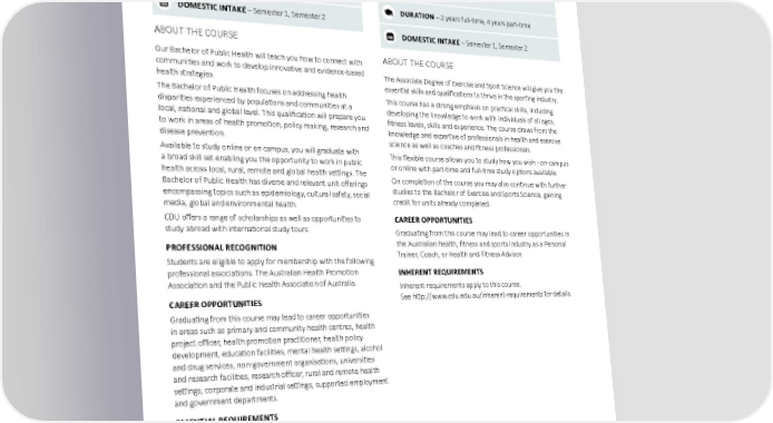 MEDICINE AND HEALTH Bachelor of Public Health Associate Degree of Exercise and Sport SATAC CODE – 104731 Science Casuarina, Online SATAC CODE – 115201 UAC CODE – 590420 Casuarina, Online Casuarina, Online UAC CODE – 592090 DURATION – 3 years full-time, 6 years part-time Casuarina, Online DURATION – 2 years full-time, 4 years part-time DOMESTIC INTAKE – Semester 1, Semester 2 DOMESTIC INTAKE – Semester 1, Semester 2 ABOUT THE COURSE Our Bachelor of Public Health will teach you how to connect with ABOUT THE COURSE communities and work to develop innovative and evidence-based The Associate Degree of Exercise and Sport Science will give you the health strategies. essential skills and qualifications to thrive in the sporting industry. The Bachelor of Public Health focuses on addressing health This course has a strong emphasis on practical skills, including disparities experienced by populations and communities at a developing the knowledge to work with individuals of all ages, local, national and global level. This qualification will prepare you fitness levels, skills and experience. The course draws from the to work in areas of health promotion, policy making, research and knowledge and expertise of professionals in health and exercise disease prevention. science as well as coaches and fitness professionals. Available to study online or on campus, you will graduate with This flexible course allows you to study how you wish - on-campus a broad skill set enabling you the opportunity to work in public or online with part-time and full-time study options available. health across local, rural, remote and global health settings. The On completion of the course you may also continue with further Bachelor of Public Health has diverse and relevant unit offerings studies to the Bachelor of Exercise and Sports Science, gaining encompassing topics such as epidemiology, cultural safety, social credit for units already completed. media, global and environmental health. CDU offers a range of scholarships as well as opportunities to CAREER OPPORTUNITIES study abroad with international study tours. Graduating from this course may lead to career opportunities in PROFESSIONAL RECOGNITION the Australian health, fitness and sports industry as a Personal Students are eligible to apply for membership with the following Trainer, Coach, or Health and Fitness Advisor. professional associations: The Australian Health Promotion INHERENT REQUIREMENTS Association and the Public Health Association of Australia. Inherent requirements apply to this course. CAREER OPPORTUNITIES See http://www.cdu.edu.au/inherent-requirements for details. Graduating from this course may lead to career opportunities in areas such as primary and community health centres, health project officer, health promotion practitioner, health policy development, education facilities, mental health settings, alcohol and drug services, non-government organisations, universities and research facilities, research officer, rural and remote health settings, corporate and industrial settings, supported employment and government departments. ESSENTIAL REQUIREMENTS As this course requires you to undertake a community project, you must demonstrate compliance with the following checks and requirements. It is your responsibility to ensure that the correct documentation is obtained prior to commencing the community project. A national and/or international police check and a current Working with Children check is required regarding suitability to undertake clinical/fieldwork placements. The majority of health facilities will also require you to present a complete immunisation schedule, and First Aid certificate. Charles Darwin University 62 2023 undergraduate and postgraduate degrees