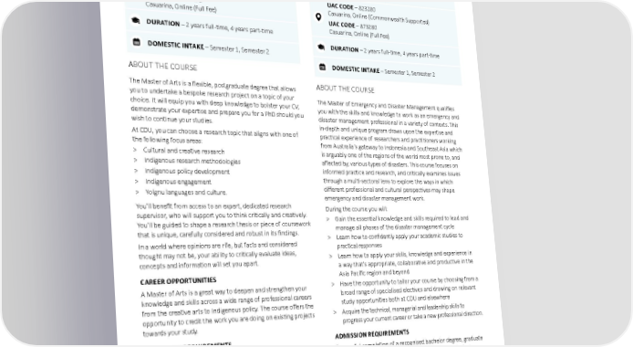 HUMANITIES, SOCIAL SCIENCES AND RELIGIOUS STUDIES Master of Arts Master of Emergency and SATAC CODE – 1CM098 Disaster Management Casuarina, Online (Commonwealth Supported) SATAC CODE – 1CM117 SATAC CODE – 1CM598 Casuarina, Online (Commonwealth Supported) Casuarina, Online (Full Fee) SATAC CODE – 1CM617 UAC CODE – 823270 Casuarina, Online (Full Fee) Casuarina, Online (Commonwealth Supported) UAC CODE – 823280 UAC CODE – 873270 Casuarina, Online (Commonwealth Supported) Casuarina, Online (Full Fee) UAC CODE – 873280 DURATION – 2 years full-time, 4 years part-time Casuarina, Online (Full Fee) DURATION – 2 years full-time, 4 years part-time DOMESTIC INTAKE – Semester 1, Semester 2 DOMESTIC INTAKE – Semester 1, Semester 2 ABOUT THE COURSE The Master of Arts is a flexible, postgraduate degree that allows ABOUT THE COURSE you to undertake a bespoke research project on a topic of your The Master of Emergency and Disaster Management qualifies choice. It will equip you with deep knowledge to bolster your CV, you with the skills and knowledge to work as an emergency and demonstrate your expertise and prepare you for a PhD should you disaster management professional in a variety of contexts. This wish to continue your studies. in-depth and unique program draws upon the expertise and At CDU, you can choose a research topic that aligns with one of practical experience of researchers and practitioners working the following focus areas: from Australia's gateway to Indonesia and Southeast Asia which > Cultural and creative research is arguably one of the regions of the world most prone to, and > Indigenous research methodologies affected by, various types of disasters. This course focuses on > Indigenous policy development informed practice and research, and critically examines issues > Indigenous engagement through a multi-sectoral lens to explore the ways in which > Yolgnu languages and culture. different professional and cultural perspectives may shape emergency and disaster management work. You'll benefit from access to an expert, dedicated research During the course you will: supervisor, who will support you to think critically and creatively. > Gain the essential knowledge and skills required to lead and You'll be guided to shape a research thesis or piece of coursework manage all phases of the disaster management cycle that is unique, carefully considered and robust in its findings. > Learn how to confidently apply your academic studies to In a world where opinions are rife, but facts and considered practical responses thought may not be, your ability to critically evaluate ideas, > Learn how to apply your skills, knowledge and experience in concepts and information will set you apart. a way that's appropriate, collaborative and productive in the CAREER OPPORTUNITIES Asia Pacific region and beyond A Master of Arts is a great way to deepen and strengthen your > Have the opportunity to tailor your course by choosing from a knowledge and skills across a wide range of professional careers broad range of specialised electives and drawing on relevant from the creative arts to Indigenous policy. The course offers the study opportunities both at CDU and elsewhere opportunity to credit the work you are doing on existing projects > Acquire the technical, managerial and leadership skills to towards your study. progress your current career or take a new professional direction. ADMISSION REQUIREMENTS ADMISSION REQUIREMENTS Successful completion of a recognised bachelor degree, graduate Successful completion of a recognised bachelor degree, graduate certificate, graduate diploma, master's degree, or equivalent certificate, graduate diploma, masters degree or equivalent international qualification. international qualification. Applicants who don't meet the entry requirements, are advised to consider applying for the Graduate INHERENT REQUIREMENTS Certificate of Emergency and Disaster Management or contact Inherent requirements apply to this course. the course coordinator in the College of Indigenous Futures, See http://www.cdu.edu.au/inherent-requirements for details. Education and the Arts by email to [email protected] for further advice. INHERENT REQUIREMENTS Inherent requirements apply to this course. See http://www.cdu.edu.au/inherent-requirements for details. Charles Darwin University 93 2023 undergraduate and postgraduate degrees