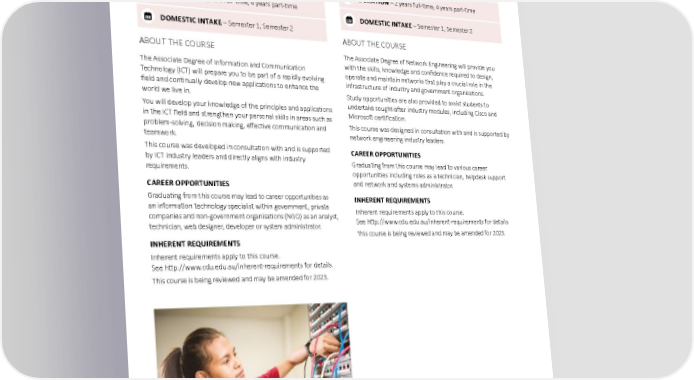 COMPUTING AND INFORMATION TECHNOLOGY Associate Degree of Information and Associate Degree of Network Engineering Communication Technology SATAC CODE – 115121 SATAC CODE – 115111 Casuarina, Online Casuarina, Online UAC CODE – 592050 UAC CODE – 592030 Casuarina, Online Casuarina, Online DURATION – 2 years full-time, 4 years part-time DURATION – 2 years full-time, 4 years part-time DOMESTIC INTAKE – Semester 1, Semester 2 DOMESTIC INTAKE – Semester 1, Semester 2 ABOUT THE COURSE ABOUT THE COURSE The Associate Degree of Network Engineering will provide you The Associate Degree of Information and Communication with the skills, knowledge and confidence required to design, Technology (ICT) will prepare you to be part of a rapidly evolving operate and maintain networks that play a crucial role in the field and continually develop new applications to enhance the infrastructure of industry and government organisations. world we live in. Study opportunities are also provided to assist students to You will develop your knowledge of the principles and applications undertake sought-after industry modules, including Cisco and in the ICT field and strengthen your personal skills in areas such as Microsoft certification. problem-solving, decision making, effective communication and This course was designed in consultation with and is supported by teamwork. network engineering industry leaders. This course was developed in consultation with and is supported CAREER OPPORTUNITIES by ICT industry leaders and directly aligns with industry Graduating from this course may lead to various career requirements. opportunities including roles as a technician, helpdesk support CAREER OPPORTUNITIES and network and systems administrator. Graduating from this course may lead to career opportunities as INHERENT REQUIREMENTS an information technology specialist within government, private Inherent requirements apply to this course. companies and non-government organisations (NGO) as an analyst, See http://www.cdu.edu.au/inherent-requirements for details. technician, web designer, developer or system administrator. This course is being reviewed and may be amended for 2023. INHERENT REQUIREMENTS Inherent requirements apply to this course. See http://www.cdu.edu.au/inherent-requirements for details. This course is being reviewed and may be amended for 2023. Charles Darwin University 27 2023 undergraduate and postgraduate degrees