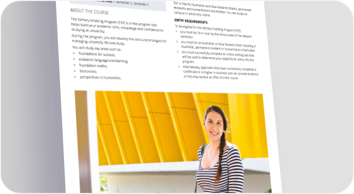 ENABLING COURSES Tertiary Enabling Program TEP is for you if: > it has been a while since you last studied and feel like you now COURSE CODE – ZTEP01 need to refresh your skills; Casuarina, Online > you did not achieve an adequate Australian Tertiary Admission Alice Springs, Rank (ATAR) or equivalent; Sydney > you have not completed other eligible qualifications that meet the minimum entry requirements for most CDU DURATION – 6 months full-time, 1 year part-time undergraduate courses. TEP is free for Australian and New Zealand citizens, permanent DOMESTIC INTAKE – Semester 1, Semester 2 residents and Humanitarian Visa holders. You can study on- campus or externally online ABOUT THE COURSE ENTRY REQUIREMENTS The Tertiary Enabling Program (TEP) is a free program that To be eligible for the Tertiary Enabling Program (TEP): helps build your academic skills, knowledge and confidence for > you must be 18 or over by the census date of the relevant studying at university. semester. During the program, you will develop the skills and strategies for > you must be an Australian or New Zealand citizen (residing in managing university life and study. Australia), permanent resident or Humanitarian Visa holder You will study key areas such as: > you must successfully complete an online writing task that > foundations for success; will be used to determine your eligibility for entry into the > academic language and learning; program. > foundation maths; > Alternatively, applicants that have successfully completed a > bioscience; Certificate IV or higher in Australia and can provide evidence of this may receive an offer into the course. > perspectives in humanities. Charles Darwin University 15 2023 undergraduate and postgraduate degrees