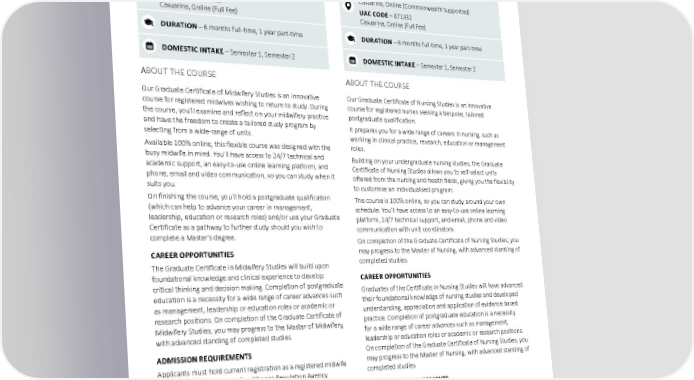 MEDICINE AND HEALTH Graduate Certificate of Midwifery Studies Graduate Certificate of Nursing Studies SATAC CODE – 1GC059 SATAC CODE – 1GC058 Casuarina, Online (Commonwealth Supported) Casuarina, Online (Commonwealth Supported) SATAC CODE – 1GC559 SATAC CODE – 1GC558 Casuarina, Online (Full Fee) Casuarina, Online (Full Fee) UAC CODE – 821322 UAC CODE – 821332 Casuarina, Online (Commonwealth Supported) Casuarina, Online (Commonwealth Supported) UAC CODE – 871322 UAC CODE – 871332 Casuarina, Online (Full Fee) Casuarina, Online (Full Fee) DURATION – 6 months full-time, 1 year part-time DURATION – 6 months full-time, 1 year part-time DOMESTIC INTAKE – Semester 1, Semester 2 DOMESTIC INTAKE – Semester 1, Semester 2 ABOUT THE COURSE ABOUT THE COURSE Our Graduate Certificate of Midwifery Studies is an innovative Our Graduate Certificate of Nursing Studies is an innovative course for registered midwives wishing to return to study. During course for registered nurses seeking a bespoke, tailored the course, you'll examine and reflect on your midwifery practice postgraduate qualification. and have the freedom to create a tailored study program by It prepares you for a wide range of careers in nursing, such as selecting from a wide-range of units. working in clinical practice, research, education or management Available 100% online, this flexible course was designed with the roles. busy midwife in mind. You'll have access to 24/7 technical and Building on your undergraduate nursing studies, the Graduate academic support, an easy-to-use online learning platform, and Certificate of Nursing Studies allows you to self-select units phone, email and video communication, so you can study when it offered from the nursing and health fields, giving you the flexibility suits you. to customise an individualised program. On finishing the course, you'll hold a postgraduate qualification The course is 100% online, so you can study around your own (which can help to advance your career in management, schedule. You'll have access to an easy-to-use online learning leadership, education or research roles) and/or use your Graduate platform, 24/7 technical support, and email, phone and video Certificate as a pathway to further study should you wish to communication with unit coordinators. complete a Master's degree. On completion of the Graduate Certificate of Nursing Studies, you CAREER OPPORTUNITIES may progress to the Master of Nursing, with advanced standing of The Graduate Certificate in Midwifery Studies will build upon completed studies. foundational knowledge and clinical experience to develop CAREER OPPORTUNITIES critical thinking and decision making. Completion of postgraduate Graduates of the Certificate in Nursing Studies will have advanced education is a necessity for a wide range of career advances such their foundational knowledge of nursing studies and developed as management, leadership or education roles or academic or understanding, appreciation and application of evidence based research positions. On completion of the Graduate Certificate of practice. Completion of postgraduate education is a necessity Midwifery Studies, you may progress to the Master of Midwifery, for a wide range of career advances such as management, with advanced standing of completed studies. leadership or education roles or academic or research positions. ADMISSION REQUIREMENTS On completion of the Graduate Certificate of Nursing Studies, you Applicants must hold current registration as a registered midwife may progress to the Master of Nursing, with advanced standing of with the Australian Health Practitioner Regulation Agency completed studies. (AHPRA). ADMISSION REQUIREMENTS Applicants must hold current registration as a registered nurse with the Australian Health Practitioner Regulation Agency (AHPRA). Charles Darwin University 125 2023 undergraduate and postgraduate degrees