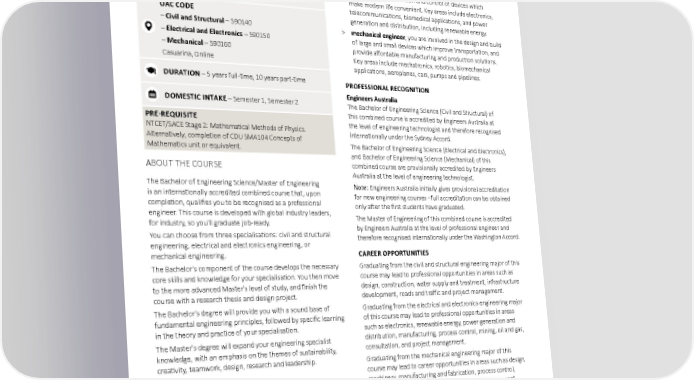 ENGINEERING Bachelor of Engineering Science/ As a professional: Master of Engineering > civil and structural engineer, you will continually challenge traditional civil and construction methods with creativity SATAC CODE and innovation to help design and manage structures for the modern world. Key areas include structures, water resources, – Civil and Structural – 104451 roads and traffic, bridges and marine structures. – Electrical and Electronics – 104461 > engineer in electrical and electronics, you are responsible – Mechanical – 104471 for the design, automation and control of devices which Casuarina, Online make modern life convenient. Key areas include electronics, telecommunications, biomedical applications, and power UAC CODE generation and distribution, including renewable energy. – Civil and Structural – 590140 > mechanical engineer, you are involved in the design and build – Electrical and Electronics – 590150 of large and small devices which improve transportation, and – Mechanical – 590160 provide affordable manufacturing and production solutions. Casuarina, Online Key areas include mechatronics, robotics, biomechanical applications, aeroplanes, cars, pumps and pipelines. DURATION – 5 years full-time, 10 years part-time PROFESSIONAL RECOGNITION DOMESTIC INTAKE – Semester 1, Semester 2 Engineers Australia The Bachelor of Engineering Science (Civil and Structural) of PRE-REQUISITE this combined course is accredited by Engineers Australia at NTCET/SACE Stage 2: Mathematical Methods of Physics. the level of engineering technologist and therefore recognised Alternatively, completion of CDU SMA104 Concepts of internationally under the Sydney Accord. Mathematics unit or equivalent. The Bachelor of Engineering Science (Electrical and Electronics), and Bachelor of Engineering Science (Mechanical) of this ABOUT THE COURSE combined course are provisionally accredited by Engineers Australia at the level of engineering technologist. The Bachelor of Engineering Science/Master of Engineering Note: Engineers Australia initially gives provisional accreditation is an internationally accredited combined course that, upon for new engineering courses - full accreditation can be obtained completion, qualifies you to be recognised as a professional only after the first students have graduated. engineer. This course is developed with global industry leaders, The Master of Engineering of this combined course is accredited for industry, so you'll graduate job-ready. by Engineers Australia at the level of professional engineer and You can choose from three specialisations: civil and structural therefore recognised internationally under the Washington Accord. engineering, electrical and electronics engineering, or mechanical engineering. CAREER OPPORTUNITIES The Bachelor's component of the course develops the necessary Graduating from the civil and structural engineering major of this core skills and knowledge for your specialisation. You then move course may lead to professional opportunities in areas such as to the more advanced Master's level of study, and finish the design, construction, water supply and treatment, infrastructure course with a research thesis and design project. development, roads and traffic and project management. The Bachelor's degree will provide you with a sound base of Graduating from the electrical and electronics engineering major fundamental engineering principles, followed by specific learning of this course may lead to professional opportunities in areas in the theory and practice of your specialisation. such as electronics, renewable energy, power generation and The Master's degree will expand your engineering specialist distribution, manufacturing, process control, mining, oil and gas, knowledge, with an emphasis on the themes of sustainability, consultation, and project management. creativity, teamwork, design, research and leadership. Graduating from the mechanical engineering major of this course may lead to career opportunities in areas such as design, machinery, manufacturing and fabrication, process control, mining, oil and gas, consultation, and project management. INHERENT REQUIREMENTS Inherent requirements apply to this course. See http://www.cdu.edu.au/inherent-requirements for details. Charles Darwin University 33 2023 undergraduate and postgraduate degrees