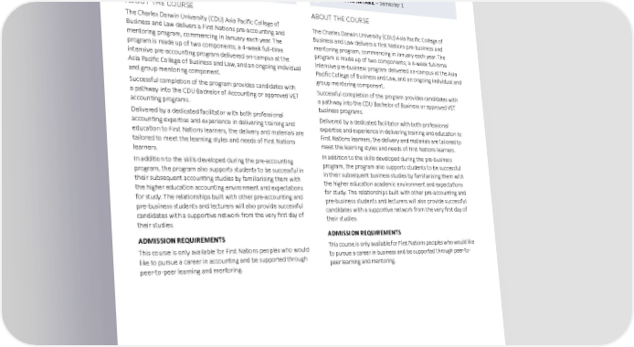 ENABLING COURSES First Nations Pre-Accounting Program First Nations Pre-Business Program COURSE CODE – ZIPAP1 COURSE CODE – ZIPBP1 Waterfront Darwin Waterfront Darwin DURATION – 4 weeks full-time DURATION – 4 weeks full-time DOMESTIC INTAKE – Semester 1 DOMESTIC INTAKE – Semester 1 ABOUT THE COURSE ABOUT THE COURSE The Charles Darwin University (CDU) Asia Pacific College of The Charles Darwin University (CDU) Asia Pacific College of Business and Law delivers a First Nations pre-accounting and Business and Law delivers a First Nations pre-business and mentoring program, commencing in January each year. The mentoring program, commencing in January each year. The program is made up of two components; a 4-week full-time program is made up of two components; a 4-week full-time intensive pre-accounting program delivered on-campus at the intensive pre-business program delivered on-campus at the Asia Asia Pacific College of Business and Law, and an ongoing individual Pacific College of Business and Law, and an ongoing individual and and group mentoring component. group mentoring component. Successful completion of the program provides candidates with Successful completion of the program provides candidates with a pathway into the CDU Bachelor of Accounting or approved VET a pathway into the CDU Bachelor of Business or approved VET accounting programs. business programs. Delivered by a dedicated facilitator with both professional Delivered by a dedicated facilitator with both professional accounting expertise and experience in delivering training and expertise and experience in delivering training and education to education to First Nations learners, the delivery and materials are First Nations learners, the delivery and materials are tailored to tailored to meet the learning styles and needs of First Nations meet the learning styles and needs of First Nations learners. learners. In addition to the skills developed during the pre-accounting In addition to the skills developed during the pre-business program, the program also supports students to be successful in program, the program also supports students to be successful their subsequent accounting studies by familiarising them with in their subsequent business studies by familiarising them with the higher education accounting environment and expectations the higher education academic environment and expectations for study. The relationships built with other pre-accounting and for study. The relationships built with other pre-accounting and pre-business students and lecturers will also provide successful pre-business students and lecturers will also provide successful candidates with a supportive network from the very first day of candidates with a supportive network from the very first day of their studies. their studies. ADMISSION REQUIREMENTS ADMISSION REQUIREMENTS This course is only available for First Nations peoples who would This course is only available for First Nations peoples who would like like to pursue a career in accounting and be supported through to pursue a career in business and be supported through peer-to- peer-to-peer learning and mentoring. peer learning and mentoring. Charles Darwin University 16 2023 undergraduate and postgraduate degrees