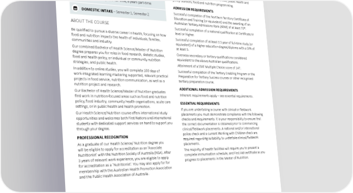 MEDICINE AND HEALTH Bachelor of Health Science/ CAREER OPPORTUNITIES Master of Nutrition As a graduate of our Bachelor of Health Science/Master of Nutrition degree you may find career opportunities in areas such SATAC CODE – 104691 as community health centres, health promotion organisations, Casuarina, Online government and non-government organisations, food industry, acute health services, sporting organisations, universities and UAC CODE – 590180 research organisations. Roles may include nutrition consulting, Casuarina, Online nutrition educator, health promotion officer, public health and policy advisors, food and nutrition programming. DURATION – 4 years full-time, 8 years part-time ADMISSION REQUIREMENTS DOMESTIC INTAKE – Semester 1, Semester 2 Successful completion of the Northern Territory Certificate of Education and Training (or equivalent) and the awarding of an Australian Tertiary Admissions Rank (ATAR) of at least 70*. ABOUT THE COURSE Successful completion of a national qualification at Certificate IV Be qualified to pursue a diverse career in health, focusing on how level or higher. food and nutrition impacts the health of individuals, families, Successful completion of at least 0.5 year of full-time study (or communities and industry. equivalent) of a higher education degree/diploma with a GPA of Our combined Bachelor of Health Science/Master of Nutrition at least 5. degree prepares you for roles in food research, dietetic studies, Overseas secondary or tertiary qualifications considered food and health policy, or individual or community nutrition equivalent to the above Australian qualifications. strategies, and public health. Attainment of a STAT Multiple Choice score of 147. In addition to online studies, you will complete 100 days of Successful completion of the Tertiary Enabling Program or the work-integrated learning mastering supported, relevant practical Preparation for Tertiary Success courses or other recognised projects in food service, nutrition communication, as well as a tertiary preparation course. nutrition project and research. ADDITIONAL ADMISSION REQUIREMENTS Our Bachelor of Health Science/Master of Nutrition graduates Inherent requirements apply – see essential requirements. find work in nutrition-focused areas such as food and nutrition policy, food industry, community health organisations, acute care ESSENTIAL REQUIREMENTS settings, or in public health and health promotion. If you are undertaking a course with clinical or fieldwork Our Health Science/Nutrition course offers international study placements you must demonstrate compliance with the following opportunities and welcomes both First Nations and international checks and requirements. It is your responsibility to ensure that students with dedicated support services on hand to support you the correct documentation is obtained prior to commencing through your degree. clinical/fieldwork placements. A national and/or international PROFESSIONAL RECOGNITION police check and a current Working with Children check are As a graduate of our Health Science/ Nutrition degree you required regarding suitability to undertake clinical/fieldwork will be eligible to apply for accreditation as an 'Associate placements. Nutritionist' with the Nutrition Society of Australia (NSA). After The majority of health facilities will require you to present a 3 years of relevant work experience, you are eligible to apply complete immunisation schedule, and First Aid certificate as you for accreditation as a `Nutritionist'. You may also apply for for progress to placements in the Master of Nutrition. membership with the Australian Health Promotion Association and the Public Health Association of Australia. Charles Darwin University 50 2023 undergraduate and postgraduate degrees