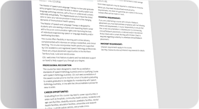 MEDICINE AND HEALTH Master of Speech and Language Therapy ADMISSION REQUIREMENTS The Master of Speech and Language Therapy is a highly SATAC CODE – 1CM632 competitive course with a limited number of places. This means Casuarina, Online (Full Fee) that although you may meet the minimum entry requirements for the course, you may not receive an offer. Subquotas are in place DURATION – 2 years full-time for First Nation and NT Resident applicants. Successful completion of a recognised bachelor degree or DOMESTIC INTAKE – Semester 1 equivalent international qualification with at least a credit average (GPA of 5.00). ABOUT THE COURSE Short-listed applicants may be required to undertake an interview. Whilst you may meet the advertised minimum entry The Master of Speech and Language Therapy is a two-year graduate requirements, this does not guarantee you a place in the course, entry program that provides the skills to deliver quality speech and instead offers will be made on merit. language pathology services, with a focus on underserved contexts ESSENTIAL REQUIREMENTS nationally and globally. This degree equips you to have the clinical skills to tailor your service provision in response to the changing If you are undertaking a course with clinical or fieldwork demands of the Australian health systems. placements you must demonstrate compliance with the following The Master of Speech and Language Therapy is designed for checks and requirements. It is your responsibility to ensure that students who are seeking a diverse and rewarding health career the correct documentation is obtained prior to commencing with a focus on communication rights and improving the lives clinical/fieldwork placements. A national and/or international of individuals experiencing speech or language disability and/or Police Check and a current Working with Children Check is swallowing disorders. required regarding suitability to undertake clinical/fieldwork The course offers flexibility in learning with online delivery, placements. complemented with intensive on-campus residentials, and clinical INHERENT REQUIREMENTS learning. This course incorporates health practicums supported Inherent requirements apply to this course. by CDU academics and registered Speech Pathology professionals. See http://www.cdu.edu.au/inherent-requirements for details. There are unique placement opportunities in the Northern Territory local, rural and remote areas. CDU welcomes First Nations students and has dedicated support on hand to help support you through your degree. PROFESSIONAL RECOGNITION The course has been designed to meet the accreditation standards of Speech Pathology Australia and is a Qualifying Course with Speech Pathology Australia. CDU will seek accreditation of the award courses prior to the first cohort of students graduating to enable graduates to be eligible for membership with Speech Pathology Australia, in line with the SPA accreditation process for new courses. CAREER OPPORTUNITIES Graduating from this course may lead to career opportunities in areas such as hospitals, community health centres, residential and age care facilities, disability services, paediatric facilities, mental health facilities, education facilities, universities and research facilities, juvenile justice centres, and private clinics. CCharharlleess D Dararwwiinn U Unniivveersrsiittyy 111155 22002233 u unndederrgrgraadduuaattee a anndd p poossttgrgraadduuaattee de degrgreeeses