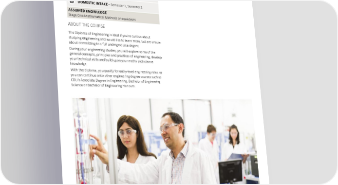 ENGINEERING Diploma of Engineering CAREER OPPORTUNITIES Graduating from the Diploma of Engineering may lead to entry- SATAC CODE – 116211 level engineering roles. Casuarina, Online INHERENT REQUIREMENTS UAC CODE – 591030 Inherent requirements apply to this course. Casuarina, Online See http://www.cdu.edu.au/inherent-requirements for details. DURATION – 1 year full-time, 2 years part-time DOMESTIC INTAKE – Semester 1, Semester 2 ASSUMED KNOWLEDGE Stage One Mathematical Methods or equivalent ABOUT THE COURSE The Diploma of Engineering is ideal if you're curious about studying engineering and would like to learn more, but are unsure about committing to a full undergraduate degree. During your engineering studies, you will explore some of the general concepts, principles and practices of engineering, develop your technical skills and build upon your maths and science knowledge. With the diploma, you qualify for entry-level engineering roles, or you can continue onto other engineering degree courses such as CDU's Associate Degree in Engineering, Bachelor of Engineering Science or Bachelor of Engineering Honours. Charles Darwin University 37 2023 undergraduate and postgraduate degrees