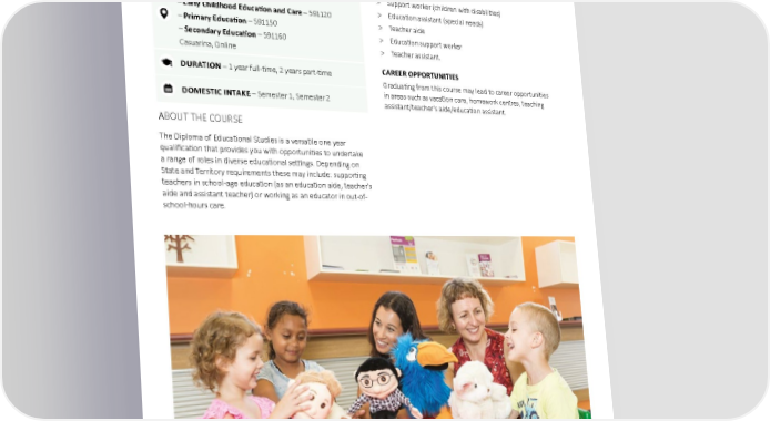 EDUCATION AND TEACHING Diploma of Educational Studies This course will prepare you to work as an: > Aboriginal and/or Torres Strait Islander education officer/worker SATAC CODE > Homeland teaching assistant – Early Childhood Education and Care – 116271 > Aboriginal and/or Torres Strait Islander language and culture – Primary Education – 116281 teaching assistant – Secondary Education – 116291 > Inclusion supports facilitator Casuarina, Online > Education assistant UAC CODE > Support worker (children with disabilities) – Early Childhood Education and Care – 591120 > Education assistant (special needs) – Primary Education – 591150 > Teacher aide – Secondary Education – 591160 > Education support worker Casuarina, Online > Teacher assistant. DURATION – 1 year full-time, 2 years part-time CAREER OPPORTUNITIES Graduating from this course may lead to career opportunities DOMESTIC INTAKE – Semester 1, Semester 2 in areas such as vacation care, homework centres, teaching assistant/teacher's aide/education assistant. ABOUT THE COURSE The Diploma of Educational Studies is a versatile one year qualification that provides you with opportunities to undertake a range of roles in diverse educational settings. Depending on State and Territory requirements these may include: supporting teachers in school-age education (as an education aide, teacher's aide and assistant teacher) or working as an educator in out-of- school-hours care. Charles Darwin University 32 2023 undergraduate and postgraduate degrees