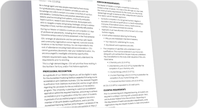 MEDICINE AND HEALTH Master of Dietetics CAREER OPPORTUNITIES As a graduate of our Master of Dietetics course you may find roles SATAC CODE – 1CM629 in hospitals as clinical dietitians, community and public health- Casuarina, Online (Full Fee) focused roles addressing the prevention of disease, working in food supply and food industry to improve healthy food access, DURATION – 2 years full-time, 4 years part-time availability and affordability, working in food services in hospitals, or settings such as aged care or childcare; through to improving DOMESTIC INTAKE – Semester 2 performance through improved nutrition in sport. ADMISSION REQUIREMENTS ABOUT THE COURSE The Master of Dietetics is a highly competitive course with a limited number of places. This means that although you may meet Be a change agent and help people make healthy food choices. the minimum entry requirements for the course, you may not be Our graduate-entry Master of Dietetics provides you with the ranked high enough to receive an offer. Subquotas are in place for knowledge and skills to embark on a career in the field of nutrition First Nation and NT Resident applicants. and dietetics. Combine theory and practical placements across > Successful completion of a recognised bachelor degree or dietetic practice including food systems, community and public equivalent international qualification in a health-related field health nutrition, research and clinical services. Be equipped with (inclusive of biomedical science, science, health sciences, skills to navigate complex and growing challenges; aiming to address nutrition, food science and exercise science); inequities in food, nutrition and health and culturally-safe practice. > Applicants must have attained a GPA of at least 5.00 in their During our Master of Dietetics course you will complete 112 days bachelor degree; of professional placements, including short intensives at our > A brief written statement detailing the following: Casuarina campus and a full-time placement in the final semester. • Why you are interested in the field of dietetics; CDU arranges all placements and has partnerships with health • Your reasons for undertaking this course; and community organisations across regional, rural and remote • Any relevant work experience and skills. locations in the Northern Territory. You are responsible for the cost of attendance including travel and accommodation. CDU > The completion of specified units undertaken in prior cannot guarantee placements near your residential location. You qualifications. This must be evidenced in your transcripts are encouraged to investigate scholarship opportunities. along with unit outlines from the year study was undertaken. Inherent requirements apply. Please read and understand the Pay close attention to the study order sequence of the units requirements prior to enrolling. listed below. This is a high demand degree. CDU will prioritise those residing in • 2 Chemistry units (0.25 EFTSL) the Northern Territory, and/or First Nations applicants. • 2 Biochemistry units (0.25 EFTSL) studied after the completion of your chemistry units PROFESSIONAL RECOGNITION • 2 Human Biology units (0.25 EFTSL) As a graduate of our Dietetics degree you will be eligible to apply • 2 Human Physiology units (0.25 ETFSL) studied after the for the Accredited Practising Dietitian credential following course completion of your human biology units accreditation with Dietitians Australia. CDU has received Program • 2 Food and Nutrition Science units (0.25 EFTSL). Qualification from Dietitians Australia (DA) and has sought advice regarding the processes for the accreditation of the dietetics At CDU 0.25 EFTSL is equivalent to 20 credit points. program. The University is planning to submit an accreditation application within the required timelines, and aiming to achieve ESSENTIAL REQUIREMENTS accreditation prior to graduation of the first cohort of students. Prior to commencing work integrated learning, all students are A graduate of an accredited program is eligible to become a required to undergo a 'working with vulnerable people' check, member of DA with dietetics qualifications, and to join the and Australian Federal Police Record Check. Depending on Accredited Practising Dietitian (APD) Program. Full details of the the requirement of health and education departments, some stages in the DA accreditation process are available at https:// organisations may also request students to meet immunisation dietitiansaustralia.org.au/becoming-a-dietitian-in-australia/ requirements. accreditation-of-dietetics-education-programs/accreditation- It is your responsibility to ensure that the correct documentation is standards-and-processes/. obtained prior to commencing work-integrated learning projects. All inquiries regarding the progress of the programs accreditation review should be directed to CDU’s Dietetics Program Coordinator. 104 Charles Darwin University 2023 undergraduate and postgraduate degrees