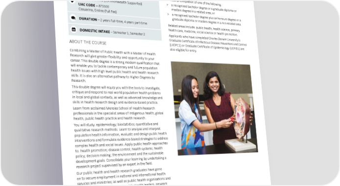 MEDICINE AND HEALTH Master of Public Health/ CAREER OPPORTUNITIES Master of Health Research Graduating from this course may lead to career opportunities in non-government organisations (NGOs) and government sectors SATAC CODE – 1CM114 in areas such as: health research, professional health practice, Casuarina, Online (Commonwealth Supported) health policy and planning, epidemiology, communicable and chronic disease control, community development and aid work. SATAC CODE – 1CM614 Casuarina, Online (Full Fee) ADMISSION REQUIREMENTS UAC CODE – 823300 Successful completion of one of the following: Casuarina, Online (Commonwealth Supported) > a recognised bachelor degree or a graduate diploma or UAC CODE – 873300 masters degree in a related area; or Casuarina, Online (Full Fee) > a recognised bachelor degree plus an honours degree or a graduate diploma or masters degree in a non-related area. DURATION – 2 years full-time, 4 years part-time Related areas include: public health, health science, primary health care, medicine, social science or health promotion. DOMESTIC INTAKE – Semester 1, Semester 2 Applicants who have completed Charles Darwin University's Graduate Certificate of Infectious Disease Prevention and Control ABOUT THE COURSE (UIDPC1) or Graduate Certificate of Epidemiology (UEPID1) are also eligible for entry. Combining a Master of Public Health with a Master of Health Research will give greater flexibility and opportunity to your career. This double degree is a strong modern qualification that will enable you to tackle contemporary and future population health issues with high level public health and health research skills. It is also an alternative pathway to Higher Degrees by Research. This double degree will equip you with the tools to investigate, critique and respond to real world population health problems in local and global contexts, as well as advanced knowledge and skills in health research design and evidence-based practice. Learn from acclaimed Menzies School of Health Research professionals in the specialist areas of Indigenous health, global health, public health practice and health research. You will study: epidemiology; biostatistics; quantitative and qualitative research methods. Learn to analyse and interpret population health information, evaluate and design public health interventions and formulate evidence-based strategies to address complex health and social issues. Apply public health approaches to: health promotion; disease control; health systems; health policy; decision making; the environment and the sustainable development goals. Consolidate your learning by undertaking a research project supervised by an expert in the field. Our public health and health research graduates have gone on to secure employment in national and international health services and ministries; as well as public health organisations and universities. They have become public health leaders, program planners, analysts, evaluators, health policy officers, professional practitioners and health researchers. This course requires a high level of academic reading and writing. Students who are not confident in their academic literacy skills are encouraged to fully utilise the University's academic support services. Charles Darwin University 101 2023 undergraduate and postgraduate degrees
