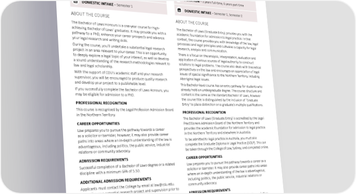 LAW AND LEGAL STUDIES Bachelor of Laws Honours Bachelor of Laws (Graduate Entry) SATAC CODE – 1BH020 SATAC CODE – 1BG015 Waterfront Darwin, Online Waterfront Darwin, Online UAC CODE – 820041 UAC CODE – 820011 Waterfront Darwin, Online Waterfront Darwin, Online DURATION – 1 year full-time, 2 years part-time DURATION – 3 years full-time, 6 years part-time DOMESTIC INTAKE – Semester 1 DOMESTIC INTAKE – Semester 1, Semester 2 ABOUT THE COURSE ABOUT THE COURSE The Bachelor of Laws Honours is a one-year course for high- The Bachelor of Laws (Graduate Entry) provides you with the achieving Bachelor of Laws' graduates. It may provide you with a academic foundation for admission to legal practice. In that pathway to a PhD, enhance your career prospects and advance context, the course provides you with knowledge of the law, legal your legal research and writing skills. processes and legal principles and cultivates a capacity for legal During the course, you'll undertake a substantial legal research research, analysis and communication. project in an area relevant to your career. This is an opportunity There is a focus on the analysis, interpretation, evaluation and to deeply explore a legal topic of your interest, as well as develop application of various sources of legal authority to construct a sound understanding of the research methodologies relevant to solutions to legal problems. The course also deals with theoretical law and legal scholarship. perspectives on the law and encourages an appreciation of legal With the support of CDU's academic staff and your research issues of special significance to the Northern Territory, including supervisor, you will be encouraged to produce quality research Aboriginal legal issues. and develop your project to a publishable level. This Bachelor-level course has an entry pathway for students who If you successfully complete the Bachelor of Laws Honours, you already hold an undergraduate degree. The course structure and may be eligible for admission to a PhD. content is the same as the standard Bachelor of Laws, however the course title is distinguished by the inclusion of `Graduate PROFESSIONAL RECOGNITION Entry' to place distinction on a graduate's multiple qualifications. This course is recognised by the Legal Profession Admission Board PROFESSIONAL RECOGNITION in the Northern Territory. The Bachelor of Laws (Graduate Entry) is accredited by the Legal CAREER OPPORTUNITIES Practitioners Admission Board of the Northern Territory and Law prepares you to pursue the pathway towards a career provides the academic foundation for admission to legal practice as a solicitor or barrister, however, it may also provide career in the Northern Territory and elsewhere in Australia. paths into areas where an in-depth understanding of the law is To be admitted to legal practice in Australia, you must also advantageous, including politics, the public service, industrial complete the Graduate Diploma in Legal Practice (GDLP). This can relations or community advocacy. be taken through the College of Law, Sydney, and completed online. ADMISSION REQUIREMENTS CAREER OPPORTUNITIES Successful completion of a Bachelor of Laws degree or a related Law prepares you to pursue the pathway towards a career as a discipline with a minimum GPA of 5.50. solicitor or barrister. It may also provide career paths into areas ADDITIONAL ADMISSION REQUIREMENTS where an in-depth understanding of the law is advantageous, including politics, the public service, industrial relations or Applicants must contact the College by email at [email protected]. community advocacy. au to discuss a potential research project and supervision prior to application. In addition to minimum GPA of 5.50, applicants are ADMISSION REQUIREMENTS required to have a research project topic and supervisor who has Successful completion of a recognised bachelor degree (other agreed to supervise the student and project before admission is than law) or equivalent international qualification. approved. INHERENT REQUIREMENTS INHERENT REQUIREMENTS Inherent requirements apply to this course. Inherent requirements apply to this course. See http://www.cdu.edu.au/inherent-requirements for details. See http://www.cdu.edu.au/inherent-requirements for details. Charles Darwin University 70 2023 undergraduate and postgraduate degrees