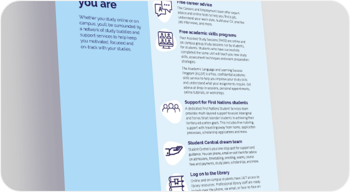 AA ne neww wworld univorld universityersity Online study buddies Study Enjoy seamless, interactive collaboration with your peers, tutors and lecturers on Learnline. Jump into support forums, join discussion boards and chat online with your fellow students – any time of the day or night, wherever across Australia and beyond. Free career advice The Careers and Employment team offer expert you are advice and online tools to help you find a job, understand your work style, build your CV, practise Whether you study online or on job interviews, and more. campus, you’ll be surrounded by Free academic skills programs a network of study buddies and Peer Assisted Study Sessions (PASS) are online and support services to help keep on campus group study sessions run by students, you motivated, focused and for students. Students who have successfully on-track with your studies. completed the same unit will teach you new study skills, assessment techniques and exam preparation strategies. The Academic Language and Learning Success Program (ALLSP) is a free, confidential academic skills service to help you improve your study skills and understand what your assignments require. Get advice at drop-in sessions, personal appointments, online tutorials, or workshops. Support for First Nations students A dedicated First Nations Student Services team provides multi-layered support to assist Aboriginal and Torres Strait Islander students in achieving their tertiary education goals. This includes free tutoring, support with travelling away from home, application processes, scholarship applications and more. Student Central dream team Student Central is your one-stop spot for support and guidance. You can phone, email or visit them for advice on admissions, timetabling, enrolling, exams, course fees and payments, study plans, scholarships, and more. Log on to the library Online and on campus students have 24/7 access to library resources. Professional library staff are ready to help over the phone, via email, or face-to-face on most campuses. Equal access A dedicated Equity Services team provides free and confidential counselling, services and support for students with a disability and/or health condition. This may include providing adjustments to your study conditions, course materials in other formats, or assistive technology. CCharharlleess D Dararwwiinn U Unniivveersrsiittyy 55 22002233 u unndederrgrgraadduuaattee a anndd p poossttgrgraadduuaattee de degrgreeeses