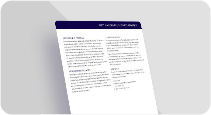 FIRST NATIONS PRE-BUSINESS PROGRAM NEED FOR THE PROGRAM COURSE STRUCTURE Business development and growth build the foundation for financial The Pre-Business program will be highly interactive and focused independence, and the number of First Nations businesses has around developing skills rather than simply acquiring knowledge. only grown by around 4% yearly since 2005. Furthermore, non- A spiral learning method will be used, which will give students Indigenous businesses express an increased interest in employing multiple opportunities to learn, practice and demonstrate their First Nations business graduates. However, First Nations people newly acquired skills. are still underrepresented in business courses, particularly in the There will be a fast turnaround for assessment and evaluation NT, where First Nations people make up 30-35% of the overall results throughout the program so that students can incorporate population. The Pre-Business program aims at increasing the feedback while the tasks are still fresh in their memory. This will number of First Nations students and graduates by equipping them give them insights into the types of tasks that will be expected when with skills and relationships that set them up for success. they study business. PROGRAM PARTNERSHIPS NEXT STEPS The program will work and operate in close collaboration with If you have any questions, are interested in partnering or have industry partners and schools. School-based programs like Clontarf potential students you would like to refer to this program for the and the Stars programs refer school-leavers to the Pre-Business next intake, please contact: program. As part of the program, students will engage with industry partners through site visits and talks. Interested Year 12 First Ulrike Kachel Nations students are asked to express their interest in participating Lecturer in Entrepreneurship and Innovation in the Pre-Business program. T: +61 8 8946 7754 E: [email protected] Contact us 1800 061 963 cdu.edu.au/study [email protected] CRICOS Provider No. 00300K (NT/VIC) | 03286A (NSW) | RTO Provider No. 0373 | TEQSA Provider ID PRV12069 Produced October 2022 | UniPrint 73803