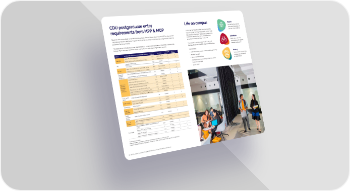 CDU postgraduate entry Life on campus Nature Surrounded by national requirements from MPP & MQP Located at the Waterfront Campus, our students parks and thousands of enjoy living and learning in a fantastic location with species of flora & fauna. Students who successfully complete the International Masters Preparation Program (MPP) or Accelerated easy access to business, industry and government International Masters Qualifying Program (MQP) gain direct entry to the following postgraduate programs located in Darwin’s city centre, close to all the at Charles Darwin University. amenities for study and leisure activities Adventure The table below includes additional requirements for some programs. Please contact CDU International The campus is home to Asia Pacific College of Walk, swim, sail or fly College if you have any questions about a pathway to a particular postgraduate program. Business & Law and the CDU International College. to experience the region’s dramatic landscapes. DURATION PROGRESSION PROGRESSION You will enjoy: STREAM POSTGRADUATE PROGRAMS AT CHARLES DARWIN UNIVERSITY FULL TIME LOCATIONS FROM MPP FROM MQP Master of Professional Accounting 1.5 yrs Waterfront Darwin ü ü • cafés and dining venues in close walking proximity Accounting • student lounges History Master of Professional Accounting (Professional Practice) 2 yrs Waterfront Darwin ü ü The Northern Territory tells Graduate Certificate of Arts 0.5 yrs Casuarina ü • library access services a unique story of ancient Arts • transport services, including a bus stop at the Master of Arts 2 yrs Casuarina ü ü art and culture. Master of Business Administration Sustainable Enterprise 1.5 yrs Waterfront Darwin ü ü front of the campus Business Master of Business Administration Sustainable Leadership 2 yrs Waterfront Darwin ü ü • prayer room Emergency Graduate Diploma of Emergency and Disaster Management 1 yr Casuarina ü ü & Disaster Management Master of Emergency and Disaster Management 2 yrs Casuarina ü ü Master of Data Science 2 yrs Sydney, Casuarina ü ü Master of Engineering (Civil and Structural) 2 yrs Casuarina ü ü Engineering, Master of Engineering (Electrical and Electronics) 2 yrs Casuarina ü ü Information Technology Master of Engineering (Mechanical engineer) 2 yrs Casuarina ü ü & Network Master of Information Technology (Cyber Security) 2 yrs Sydney, Casuarina ü ü Engineering Master of Information Technology (Information Systems) 2 yrs Sydney, Casuarina ü ü Master of Information Technology (Software Engineering) 2 yrs Casuarina ü ü Environmental Master of Environmental Management 2 yrs Casuarina ü ü Science Graduate Diploma of Health Research 1 yr Casuarina ü ü Health Research Master of Health Research 1.5 yrs Casuarina ü ü Health Science Master of Nutrition* 2 yrs Casuarina ü Indigenous Graduate Diploma of Indigenous Policy Development 1 yr Casuarina ü ü Knowledges Master of Public Policy 2 yrs Casuarina ü ü Medical Laboratory Master of Medical Laboratory Science 2 yrs Casuarina ü Science Nursing & Master of Nursing Practice (Pre-registration)* 2 yrs Casuarina ü Midwifery Master of Midwifery 1.5 yrs Sydney ü Graduate Certificate of Infectious Disease Prevention and 0.5 yrs Casuarina ü Control Graduate Diploma of Public Health 1 yr Casuarina ü ü Public Health Master of Public Health 1.5 yrs Casuarina ü ü Master of Public Health/ Master of Health Research 2 yrs Casuarina ü ü *Additional requirements: Master of Nutrition - Achieving an overall score of 7.0 and no band less than 7.0 or equivalent. Master of Nursing Practice (Pre-Registration) - Achieving an overall score of 7.0 and no band less than 7.0 or equivalent. CRICOS Provider No. 00300K (NT/VIC) I 03286A (NSW) | RTO Provider No. 0373 | PRV12069 | Australian University 20
