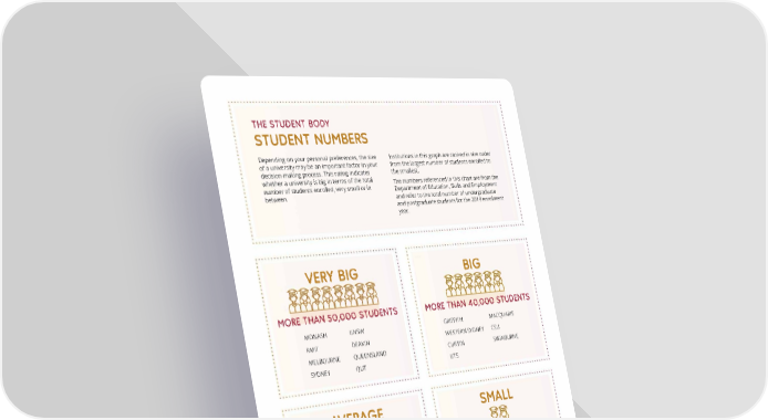 THE STUDENT BODY STUDENT NUMBERS Depending on your personal preferences, the size Institutions in this graph are ranked in size order of a university may be an important factor in your from the largest number of students enrolled to decision-making process. This rating indicates the smallest. whether a university is big in terms of the total The numbers referenced in this chart are from the number of students enrolled, very small or in Department of Education, Skills and Employment between. and refer to the total number of undergraduate and postgraduate students for the 2019 enrolment year. VERY BIG BIG � � MORE THAN 50,000 STUDENTS MORE THAN 40,000 STUDENTS MONASH UNSW GRIFFITH MACQUARIE RMIT DEAKIN WESTERN SYDNEY CSU MELBOURNE QUEENSLAND CURTIN SWINBURNE SYDNEY QUT UTS AVERAGE SMALL � � MORE THAN 30,000 STUDENTS FEWER THAN 30,000 STUDENTS vu FLINDERS UWA LATROBE WOLLONGONG ADELAIDE MURDOCH JCU TASMANIA ACU CQUni USQ SOUTHERN CROSS NEWCASTLE ECU ANU UNE UniSA FEDERATION CDU VERY SMALL SUNSHINE COAST NOTRE DAME FEWER THAN 20,000 CANBERRA BOND STUDENTS